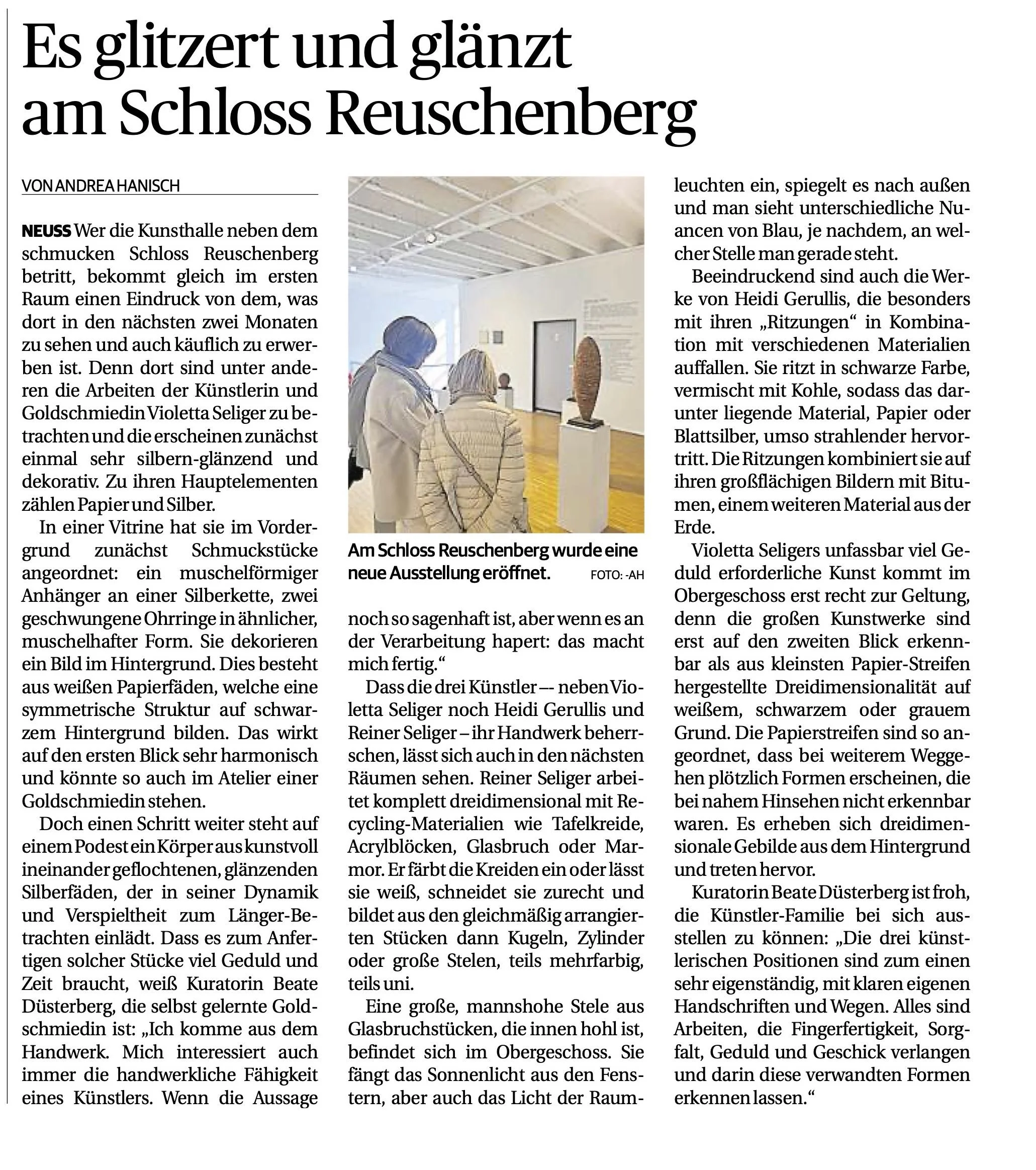 Die Drei Künstlerischen Positionen sind zum einen sehr eigenständig, mit klaren eigenen Handschriften und Wegen an ihr Material heran zu treten. Der Arbeitsweise und Anmutung lässt sich eine gewisse Gemeinsamkeit jedoch nicht absprechen. Alle drei verrichten eine ganze Reihe von „Fleißarbeiten“ um zu ihrem fertigen Werk zu gelangen. Sei es die zahllose Aneinanderreihung von Kreiden, Glasbruch oder Acrylblöcken bei Reiner Seliger, die minuziösen Reizungen in pastöser Farbe gemischt mit Kohlestaub, Schichtungen von Farbe auf die dann feinsäuberlich Blattsilber über Blattsilber aufgebracht wird bei Heidi Gerullis oder die akaribischen Papierschnitte und feine Faltungen sowie Sägungen in Silber bei Violetta Elisa Seliger. Alles sind Arbeiten, die Fingerfertigkeit, Sorgfalt, Geduld und Geschick verlangen, die zumindest Violetta Seliger in die Wiege gelegt scheint und eben diese verwandten Formen erkennen lässt. Diese Gemeinsamkeit der Reihungen, Schichtungen und ein Hang zur Dreidimensionalität lässt verleiten zu einem Titel, der die Beziehung der drei Künstler zueinander erkennen lässt, eben nicht nur rein familiär, sondern auch in den Kunstwerken selbst. Und doch arbeitet jede/r auf seine eigenen Weise und in seiner eigenen Ausdrucksform.